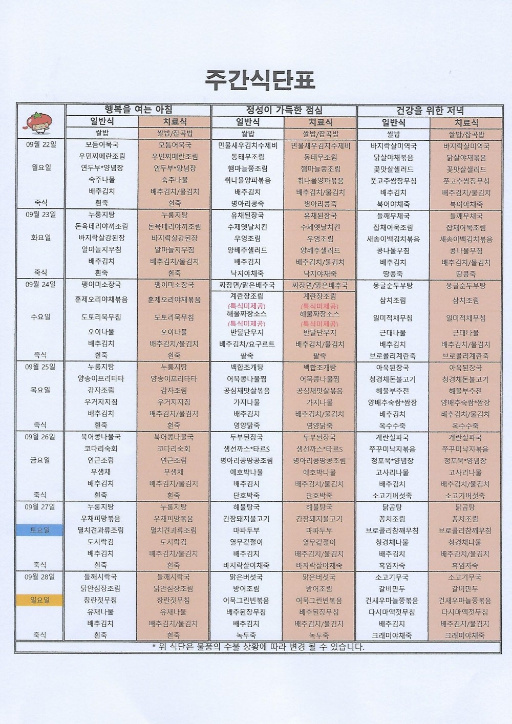마산 더편한요양병원 #9월 넷째주식단표 페이지 정보 작성자 관리자 댓글 0건 조회 162회 작성일 25-09-22 08:56 목록 본문 안녕하세요 마산 더편한요양병원 주간식단표 알려드립니다^^*저희 더편한요양병원에서는 대학원 석사를 취득한 임상영양사가 건강하고 맛있는 식사를 제공하고 있습니다. 댓글 0 댓글목록 등록된 댓글이 없습니다.