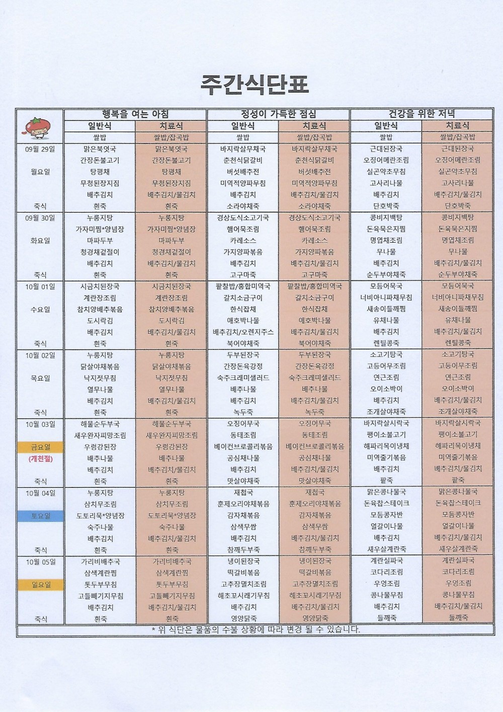 마산 더편한요양병원 #9월 다섯째주식단표 페이지 정보 작성자 관리자 댓글 0건 조회 155회 작성일 25-09-29 09:58 목록 본문 안녕하세요 마산 더편한요양병원 주간식단표 알려드립니다^^*저희 더편한요양병원에서는 대학원 석사를 취득한 임상영양사가 건강하고 맛있는 식사를 제공하고 있습니다. 댓글 0 댓글목록 등록된 댓글이 없습니다.