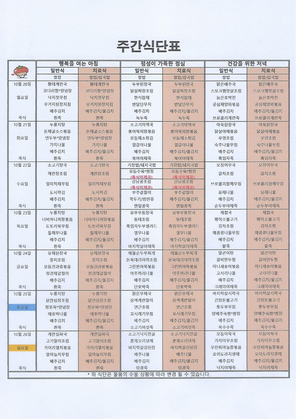 마산 더편한요양병원 #10월 셋째주식단표 페이지 정보 작성자 관리자 댓글 0건 조회 145회 작성일 25-10-20 09:52 목록 본문 안녕하세요 마산 더편한요양병원 주간식단표 알려드립니다^^*저희 더편한요양병원에서는 대학원 석사를 취득한 임상영양사가 건강하고 맛있는 식사를 제공하고 있습니다. 댓글 0 댓글목록 등록된 댓글이 없습니다.