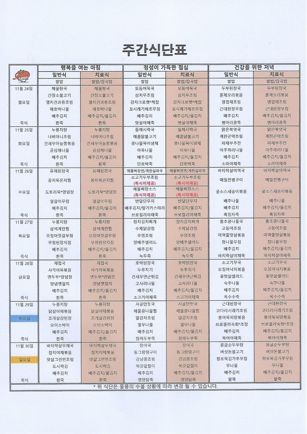 마산 더편한요양병원 #11월 넷째주식단표 페이지 정보 작성자 관리자 댓글 0건 조회 59회 작성일 25-11-24 10:00 목록 본문 안녕하세요 마산 더편한요양병원 주간식단표 알려드립니다^^*저희 더편한요양병원에서는 대학원 석사를 취득한 임상영양사가 건강하고 맛있는 식사를 제공하고 있습니다. 댓글 0 댓글목록 등록된 댓글이 없습니다.