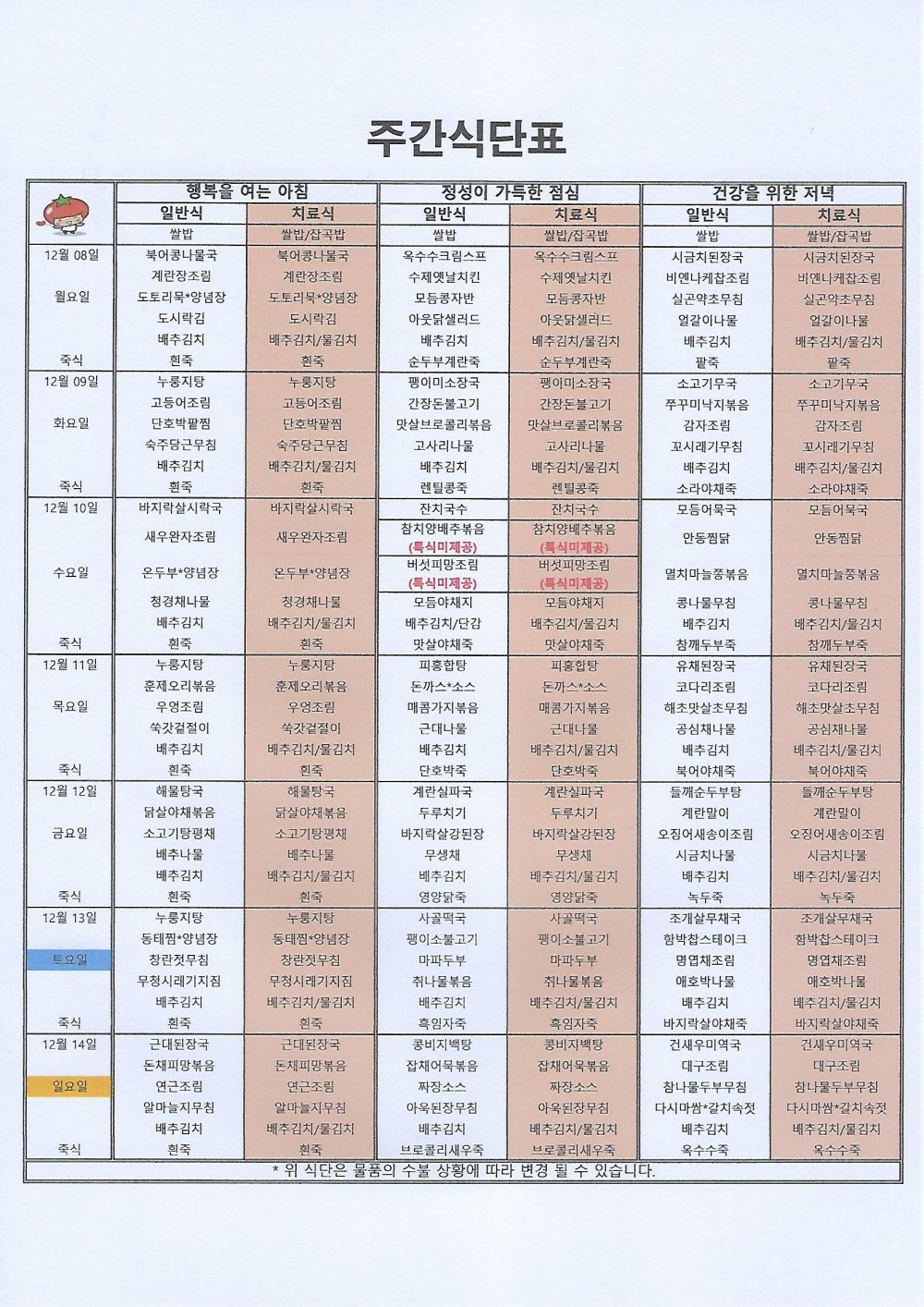 마산 더편한요양병원 #12월 둘째주식단표 페이지 정보 작성자 관리자 댓글 0건 조회 64회 작성일 25-12-08 09:00 목록 본문 안녕하세요 마산 더편한요양병원 주간식단표 알려드립니다^^*저희 더편한요양병원에서는 대학원 석사를 취득한 임상영양사가 건강하고 맛있는 식사를 제공하고 있습니다. 댓글 0 댓글목록 등록된 댓글이 없습니다.