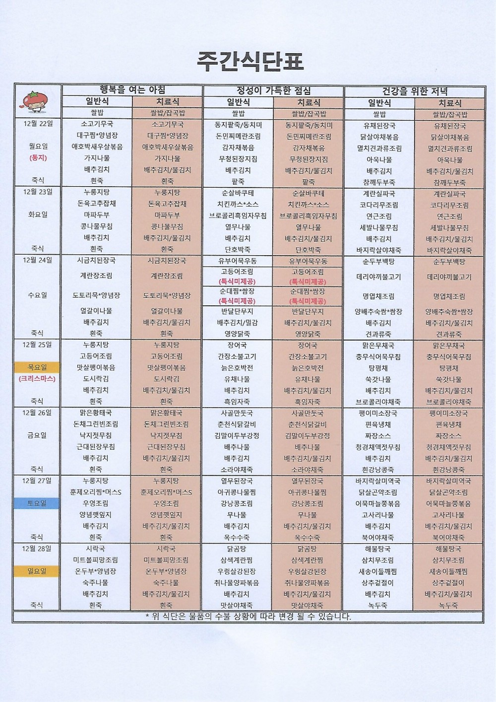 마산 더편한요양병원 #12월 넷째주식단표 페이지 정보 작성자 관리자 댓글 0건 조회 97회 작성일 25-12-22 10:06 목록 본문 안녕하세요 마산 더편한요양병원 주간식단표 알려드립니다^^*저희 더편한요양병원에서는 대학원 석사를 취득한 임상영양사가 건강하고 맛있는 식사를 제공하고 있습니다. 댓글 0 댓글목록 등록된 댓글이 없습니다.