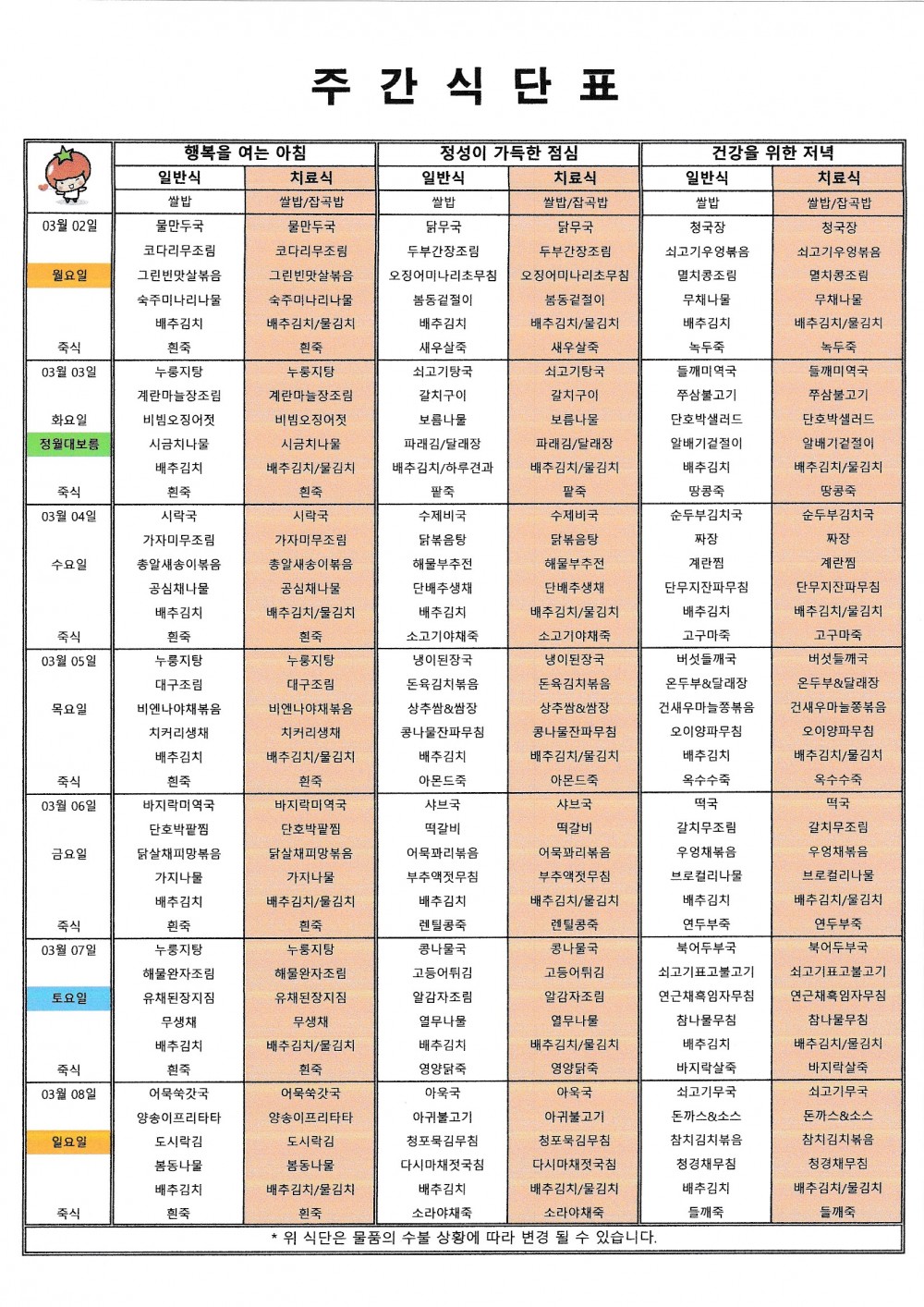 마산 더편한요양병원 #3월 첫째주 식단표 페이지 정보 작성자 관리자 댓글 0건 조회 79회 작성일 26-02-27 15:27 목록 본문 안녕하세요!!! 마산 더편한요양병원 주간식단표 알려드립니다^^ 댓글 0 댓글목록 등록된 댓글이 없습니다.