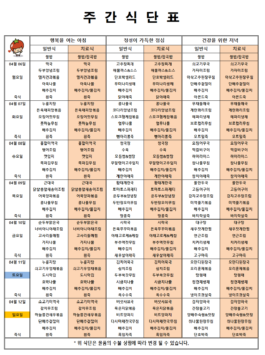 마산 더편한요양병원 #4월 둘째주 식단표 페이지 정보 작성자 관리자 댓글 0건 조회 44회 작성일 26-04-06 08:30 목록 본문 안녕하세요!!! 마산 더편한요양병원 주간식단표 알려드립니다^^ 댓글 0 댓글목록 등록된 댓글이 없습니다.