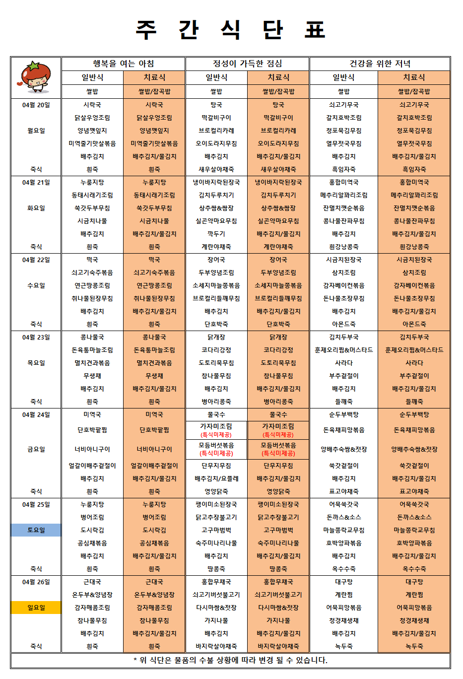 마산 더편한요양병원 #4월 넷째주 식단표 페이지 정보 작성자 관리자 댓글 0건 조회 2회 작성일 26-04-17 15:48 목록 본문 안녕하세요!!! 마산 더편한요양병원 주간식단표 알려드립니다^^ 댓글 0 댓글목록 등록된 댓글이 없습니다.