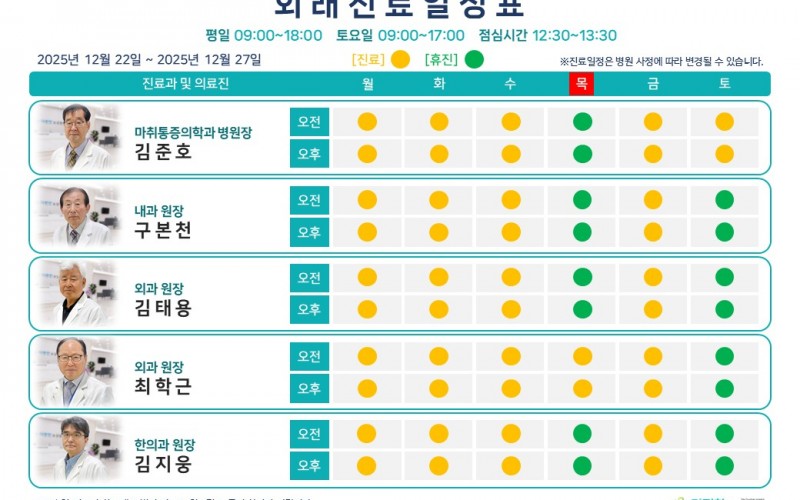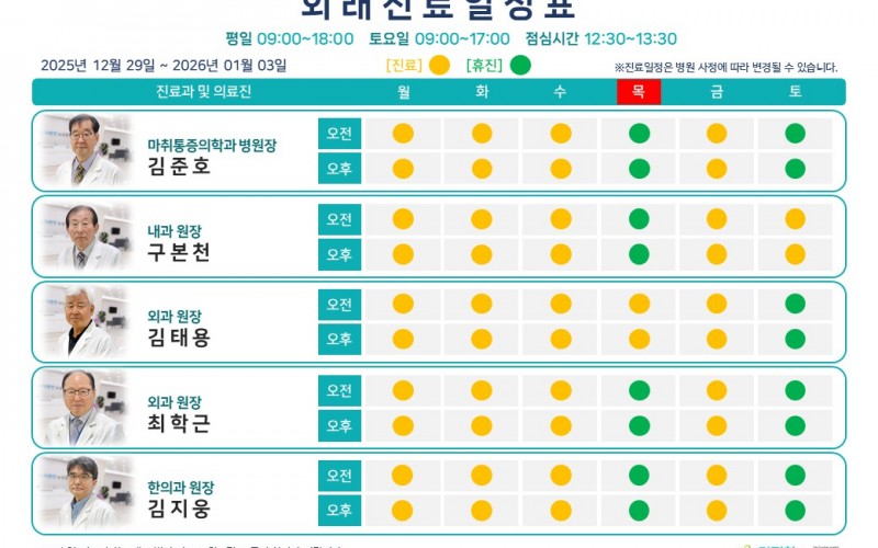 *12/30(화) ~ 12/31(수) 내과 : 구본천 원장 휴진진료 일정은 병원 사정에 따라 변경 될 수 있습니다.일요일은..
