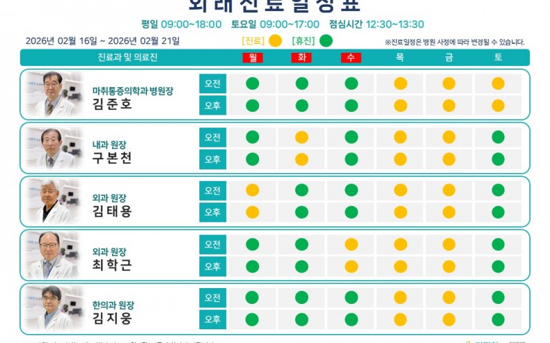 진료 일정은 병원 사정에 따라 변경 될 수 있습니다. 일요일은 휴진입니다.