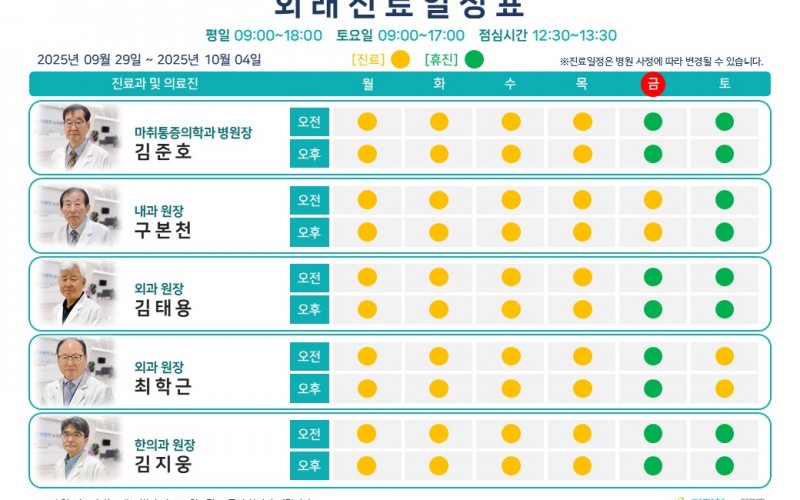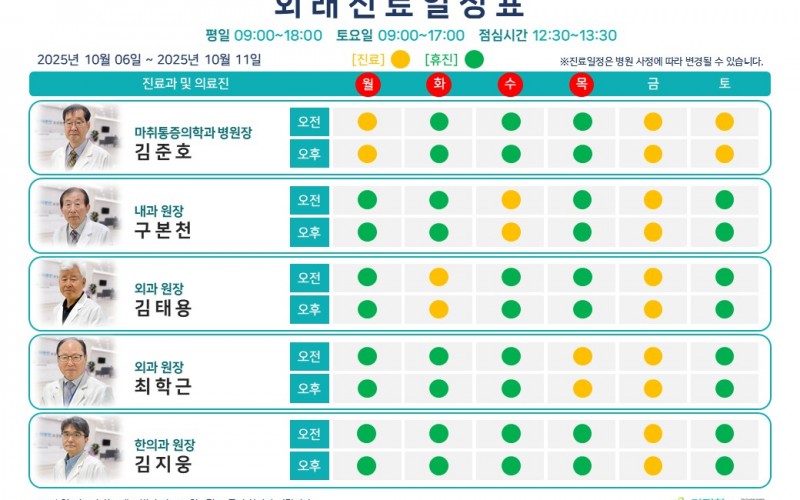 진료 일정은 병원 사정에 따라 변경 될 수 있습니다.일요일은 휴진입니다.