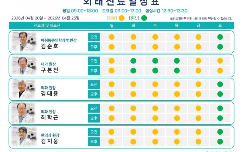 진료 일정은 병원 사정에 따라 변경 될 수 있습니다.일요일은 휴진입니다.※4/16(목) 외과 : 김태용 원장 휴진※4/17..
