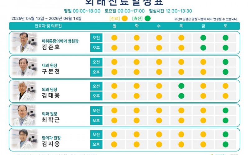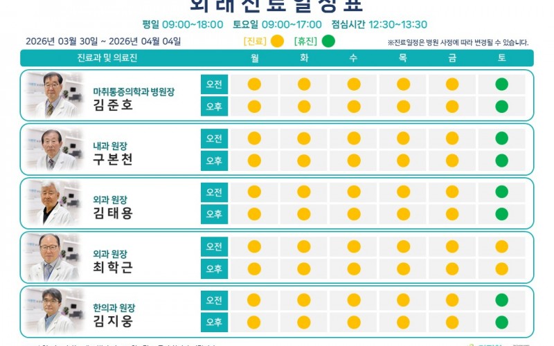 진료 일정은 병원 사정에 따라 변경 될 수 있습니다.일요일은 휴진입니다.※4/3(금) 외과: 김태용 원장 - 오후 진료 휴..