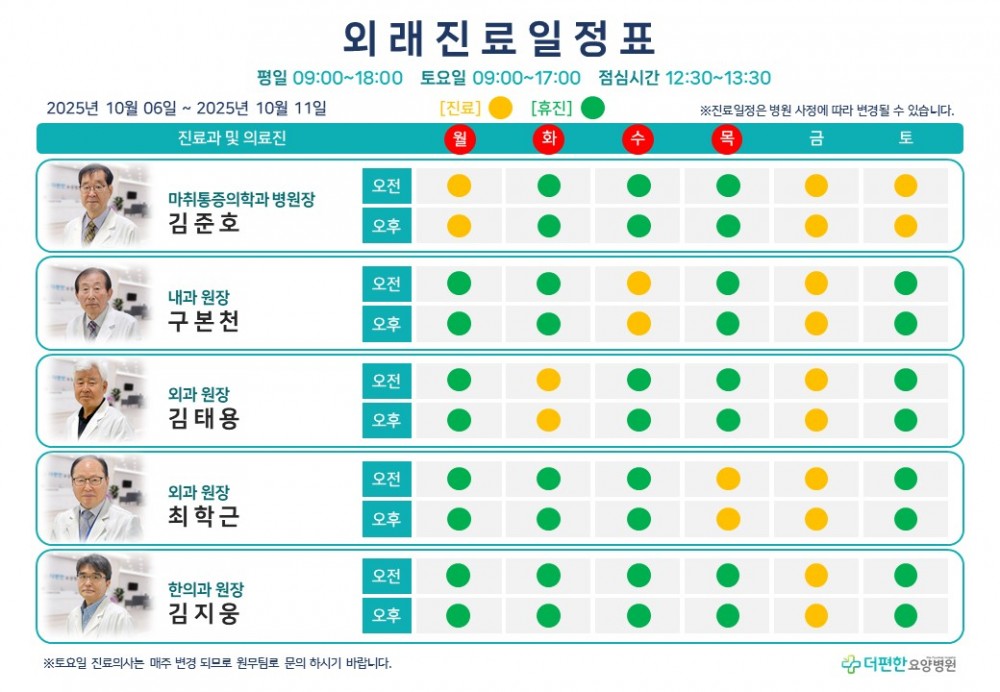 25년 10월 둘째 주 외래진료일정표 페이지 정보 작성자 관리자 댓글 0건 조회 86회 작성일 25-10-01 11:18 목록 본문 진료 일정은 병원 사정에 따라 변경 될 수 있습니다.일요일은 휴진입니다. 댓글 0 댓글목록 등록된 댓글이 없습니다.
