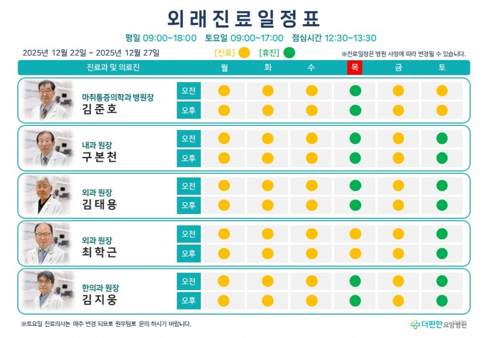 25년 12월 넷째 주 외래진료일정표 페이지 정보 작성자 관리자 댓글 0건 조회 56회 작성일 25-12-01 11:24 목록 본문 *12/23(화) ~ 12/24(수) 외과 : 최학근 원장 휴진,*12/26(금) 외과 : 김태용 원장 휴진입니다.진료 일정은 병원 사정에 따라 변경 될 수 있습니다.일요일은 휴진입니다. 댓글 0 댓글목록 등록된 댓글이 없습니다.