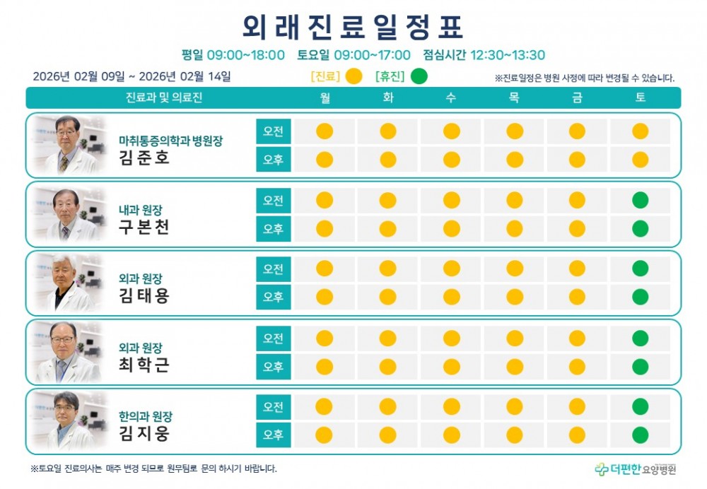 26년 2월 둘째 주 외래진료일정표 페이지 정보 작성자 관리자 댓글 0건 조회 2회 작성일 26-01-30 15:42 목록 본문 진료 일정은 병원 사정에 따라 변경 될 수 있습니다.일요일은 휴진입니다. 댓글 0 댓글목록 등록된 댓글이 없습니다.