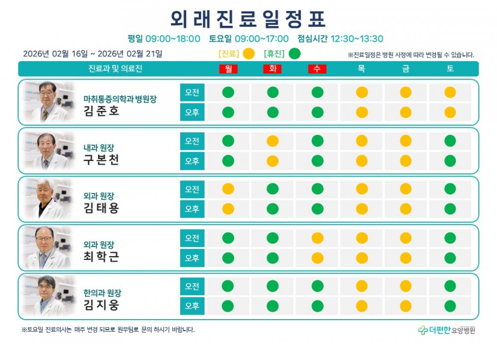 26년 2월 셋째 주 외래진료일정표 페이지 정보 작성자 관리자 댓글 0건 조회 4회 작성일 26-01-30 15:42 목록 본문 진료 일정은 병원 사정에 따라 변경 될 수 있습니다.일요일은 휴진입니다. 댓글 0 댓글목록 등록된 댓글이 없습니다.