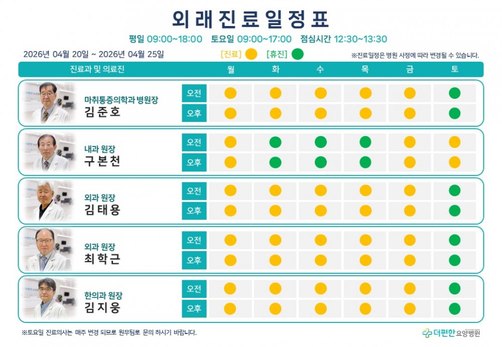 26년 4월 넷째 주 외래진료일정표 페이지 정보 작성자 관리자 댓글 0건 조회 31회 작성일 26-03-30 15:14 목록 본문 진료 일정은 병원 사정에 따라 변경 될 수 있습니다.일요일은 휴진입니다.*4/21(화) ~ 4/23(목) 내과 : 구본천 원장 휴진 댓글 0 댓글목록 등록된 댓글이 없습니다.